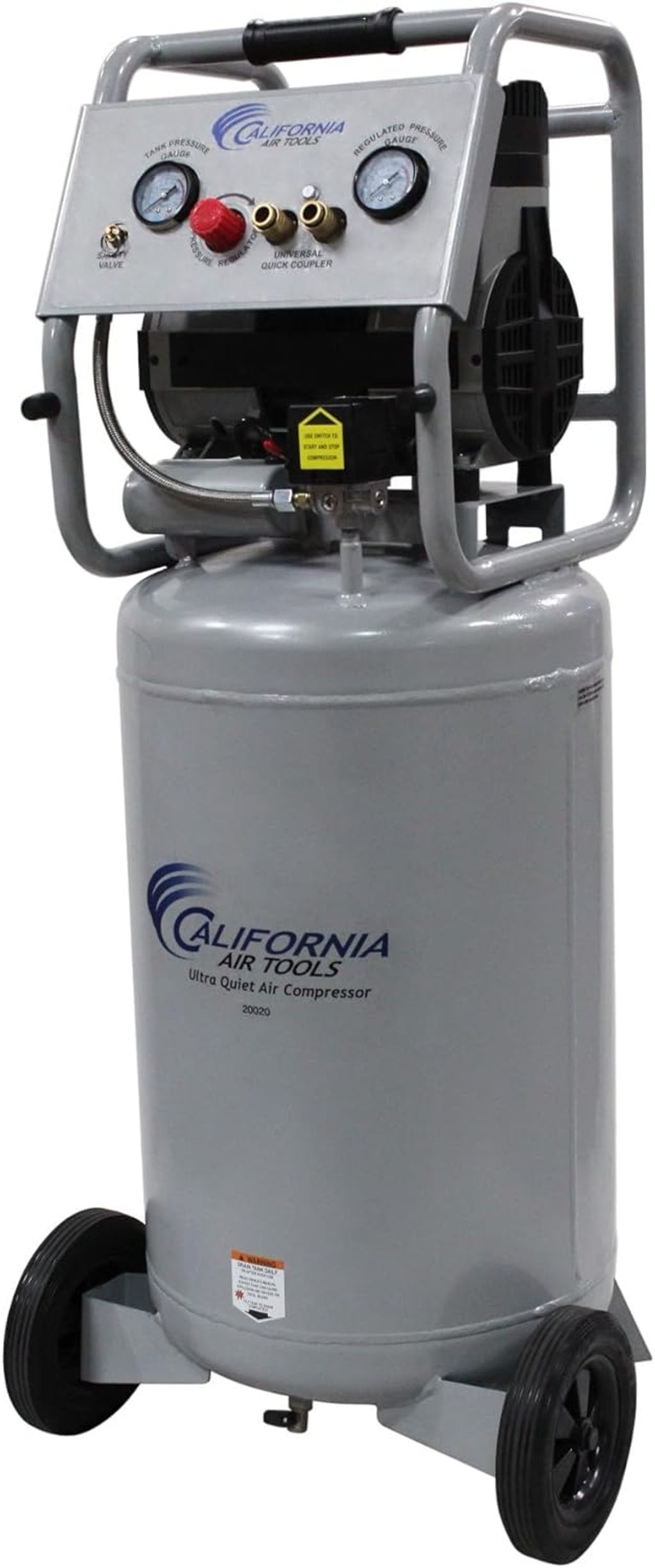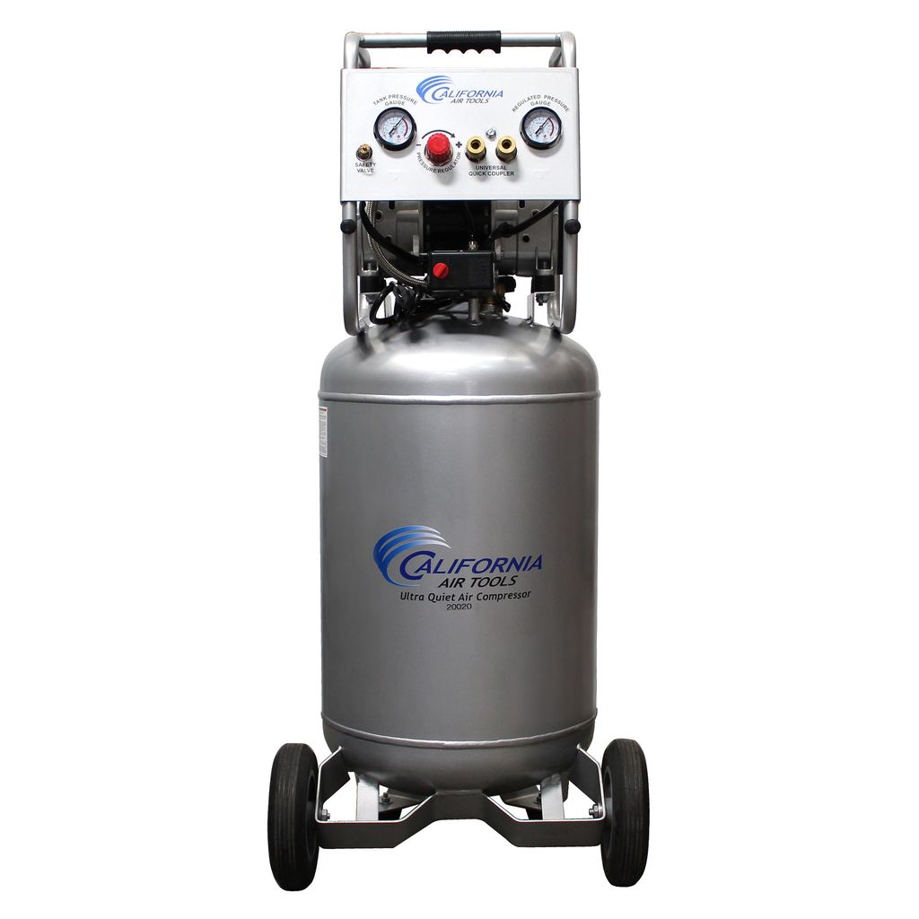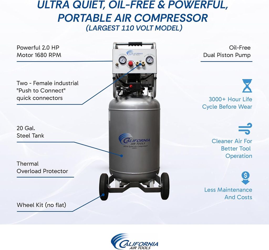 The California Air Tools Ultra Quiet, Oil-Free and Powerful 2.0 Hp Portable 20-Gallon Air Compressor stands as one of the quieter compressors in the industry, with a noise level of just 70 decibels. Ideal for environments where noise is a concern, this super quiet air compressor integrates seamlessly into any workspace. It is powered by a powerful 2.0 HP motor that runs at a low 1680 RPM, offering powerful performance with minimal noise and wear, thereby extending its lifespan and boosting efficiency. The largest 110 volt air compressor model available. Featuring an oil-free dual piston pump system, this oilless air compressor is engineered for high performance and lasting durability, with a life cycle surpassing 3000 hours—outperforming similar models. With a maximum pressure of 125 PSI, the 20-gallon air tank is designed to store more air for higher demand air tools such as spray guns and sanders. Perfect for the shop or garage. Weighing 114 pounds, this air compressor is effortlessly portable with its wheels (no flat). It’s also equipped with dual pressure gauges and two industrial "Push to Connect" quick connectors for enhanced usability and efficiency. At California Air Tools, we pride ourselves on delivering innovative, top-tier technology in air compressors that meet the needs of both professionals and hobbyists without compromising on power or user-friendliness. Elevate your workspace with the California Air Tools Ultra Quiet, Oil-Free and Powerful 2.0 Hp Portable 20-Gallon Air Compressor. Discover the bliss of superior performance coupled with whisper-quiet operation, designed to enhance your efficiency and comfort.