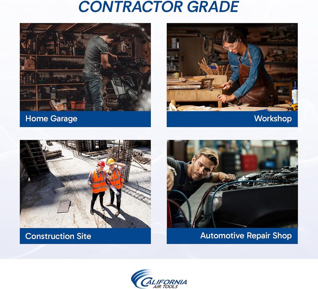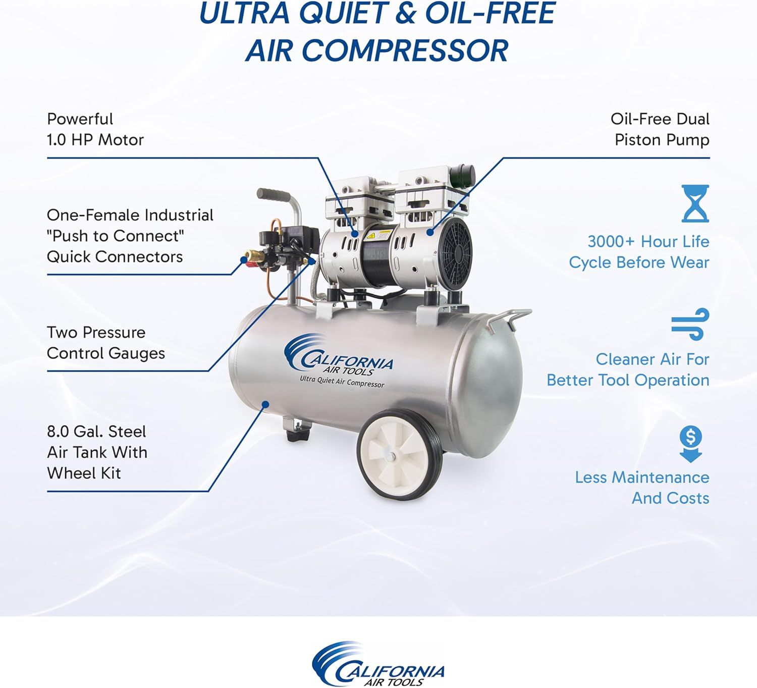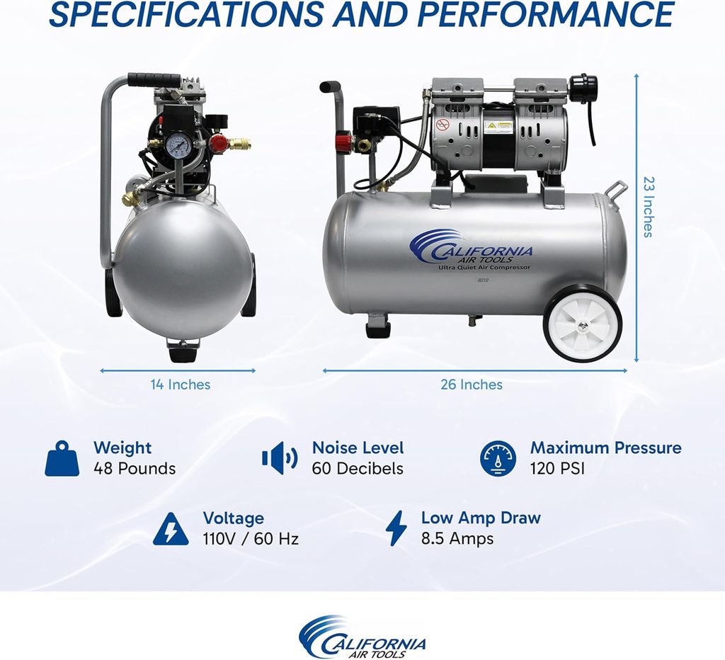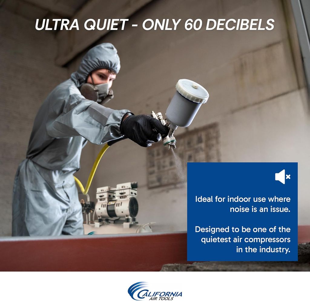 The California Air Tools Ultra Quiet & Oil-Free Air Compressor sets the standard for high-performance air compressors with an industry-leading noise level of only 60 decibels. Perfect for indoor use, this super quiet air compressor allows you to work without the disruption of loud noise, making it ideal for environments where peace and quiet are essential. Its powerful 1.0 HP motor operates at a mere 1680 RPM, resulting in less wear and significantly quieter operation. Engineered with an oil-free Dual Piston Pump System, the California Air Tools oilless air compressor promises exceptional durability and performance. Its robust design ensures a life cycle of over 3000 hours before wear, translating to fewer maintenance issues and uninterrupted workflow. Whether in cold or warm climates, or even uneven terrains, this compressor maintains optimal performance, making it a versatile tool for any project. Weighing just 48 pounds and equipped with a convenient wheel kit, this lightweight air compressor with wheels is remarkably easy to maneuver and position exactly where you need it. From project to project, its mobility ensures that setting up and moving are as effortless as possible. This compressor also includes features such as two pressure control gauges and industrial ""Push to Connect"" quick connectors, enhancing its ease of use and efficiency. At California Air Tools, we pride ourselves on delivering innovative, top-tier technology in air compressors that meet the needs of both professionals and hobbyists without compromising on power or user-friendliness. Elevate your workspace with the California Air Tools Ultra Quiet & Oil-Free Air Compressor. Discover the bliss of superior performance coupled with whisper-quiet operation, designed to enhance your efficiency and comfort.