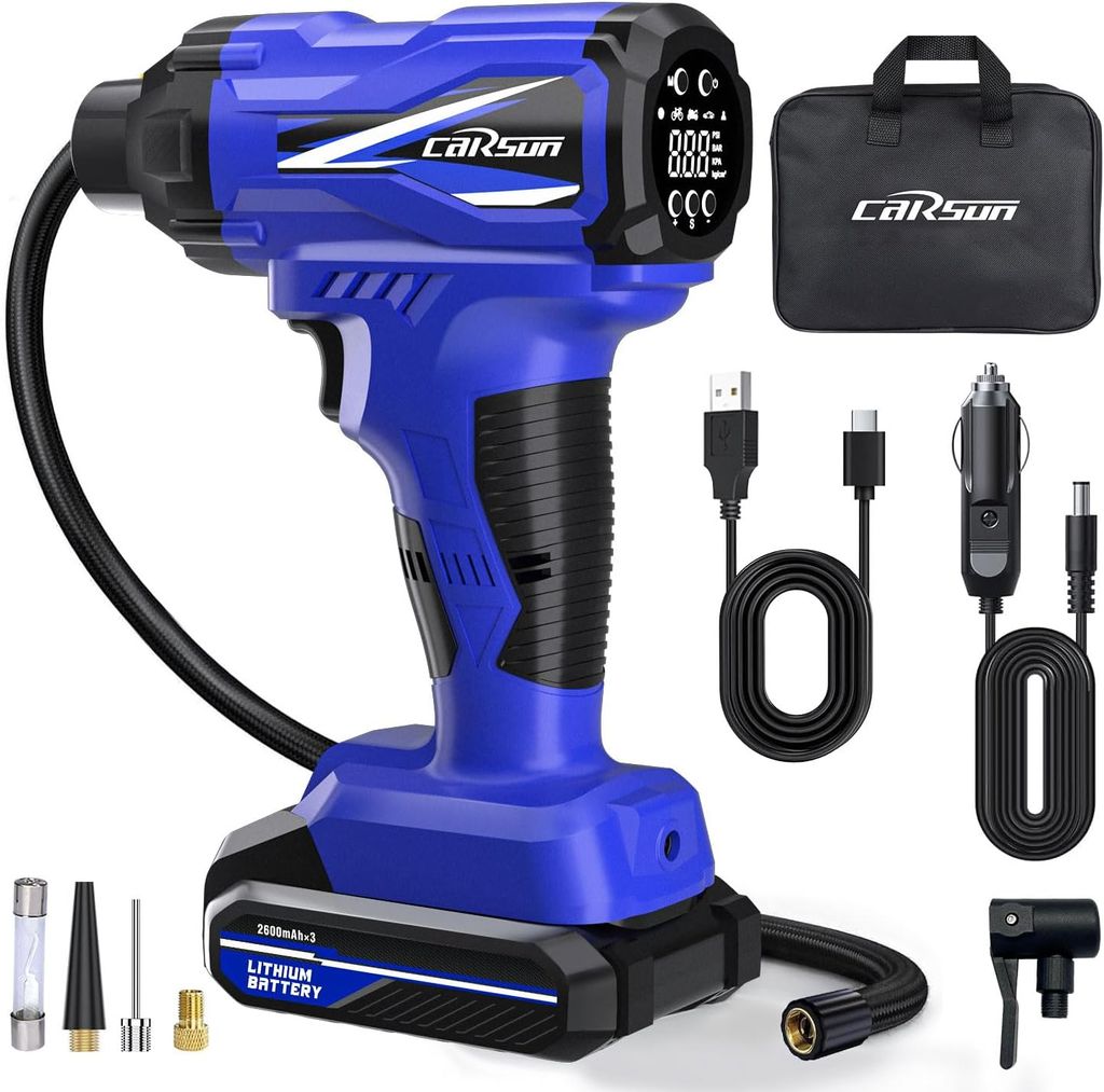 CARSUN Tire Inflator Portable Air Compressor, 150PSI Cordless Tire Pump with DC 12V/Battery Dual Power Supplies, Portable Handheld Air Pump, Digital Pressure Gauge for Car Tires, Bicycles, Balls, Blue