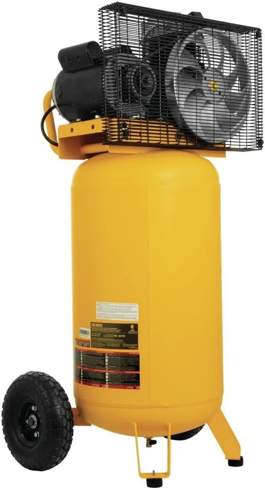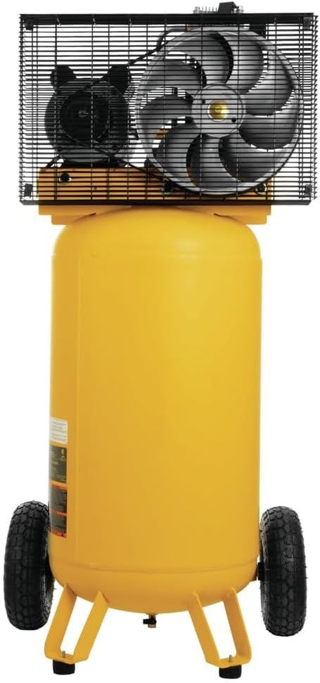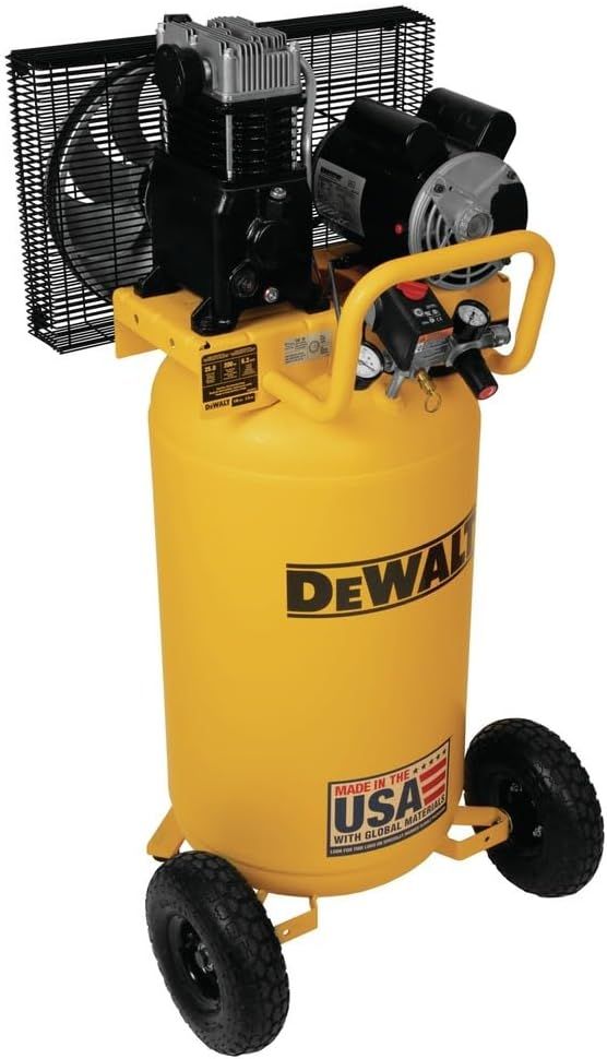 DEWALT 25 Gallon Vertical Air Compressor, a premium choice for both professional and personal use. This portable air compressor is engineered to deliver robust performance, ensuring your tools are always powered and your projects are completed with precision. With a 2 HP motor, this air compressor offers the strength and reliability you expect from DEWALT, a brand synonymous with quality and durability. Designed with a belt drive mechanism, this 25 gallon air compressor provides a quieter and smoother operation, boasting a noise level of just 79 dB. This allows for a more comfortable working environment, minimizing disturbances to those around you. The high flow regulator ensures maximum air delivery, making it ideal for a wide range of applications, from inflating tires to powering pneumatic tools. Operating at a maximum pressure of 200 PSI, this air compressor offers unparalleled power and efficiency. It delivers an impressive 7.7 CFM at 40 PSI and 6.2 CFM at 90 PSI, making it suitable for tasks that require a consistent and reliable air supply. The oil-lubed pump enhances the compressor's longevity and performance, reducing wear and tear over time. The DEWALT 25 Gallon Vertical Air Compressor is built for convenience and mobility. Its sturdy 10-inch heavy-duty pneumatic wheels allow for easy transportation across various terrains, making it a truly portable solution for your air compressor needs. Whether you are moving it around your workshop or transporting it to a job site, this compressor is designed to go where you need it. With its combination of power, efficiency, and portability, the DEWALT 25 Gallon Vertical Air Compressor is an essential tool for any workshop. Trust in DEWALT's engineering excellence to deliver a product that not only meets but exceeds your expectations, providing reliable service for years to come. Invest in quality, invest in DEWALT.