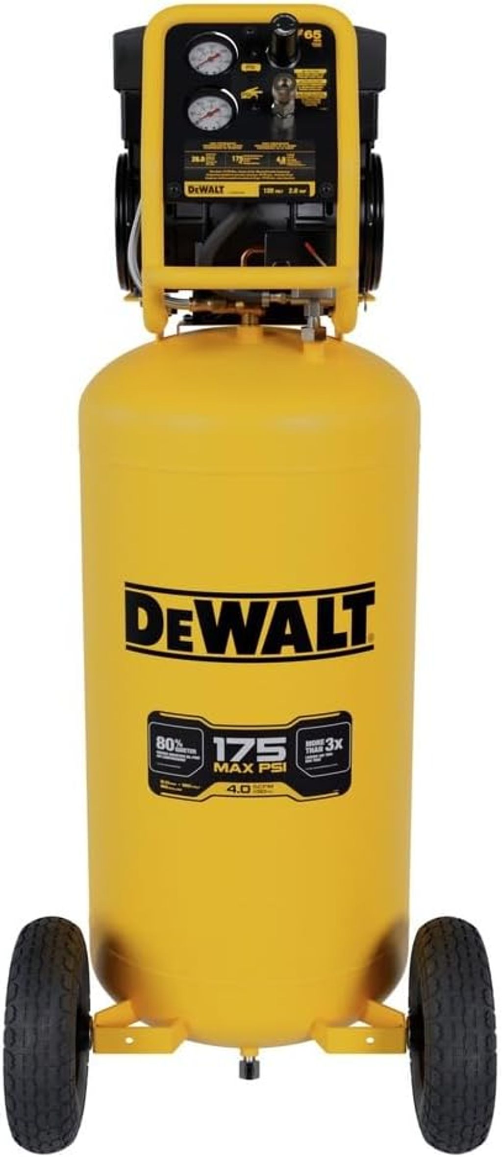 The DEWALT 26 Gallon Quiet Air Compressor (DXCMSAC260) delivers 4.0 SCFM at 90 psi with a noise level of 65 dBA. This air compressor has big capacity and power yet it is 80% quieter than standard oil free air compressors. It is powerful enough for the toughest grease gun, drills, hammer, finish nailer, framing nailer, impact wrench, ratchet and spray gun projects. The roll cage design protects all vital components while the conveniently located control panel puts your gauges, regulator and quick connect at your fingertips. These combined features along with the 10 inch heavy-duty pneumatic wheels provide added mobility and easy storage around the shop, garage or on a worksite.