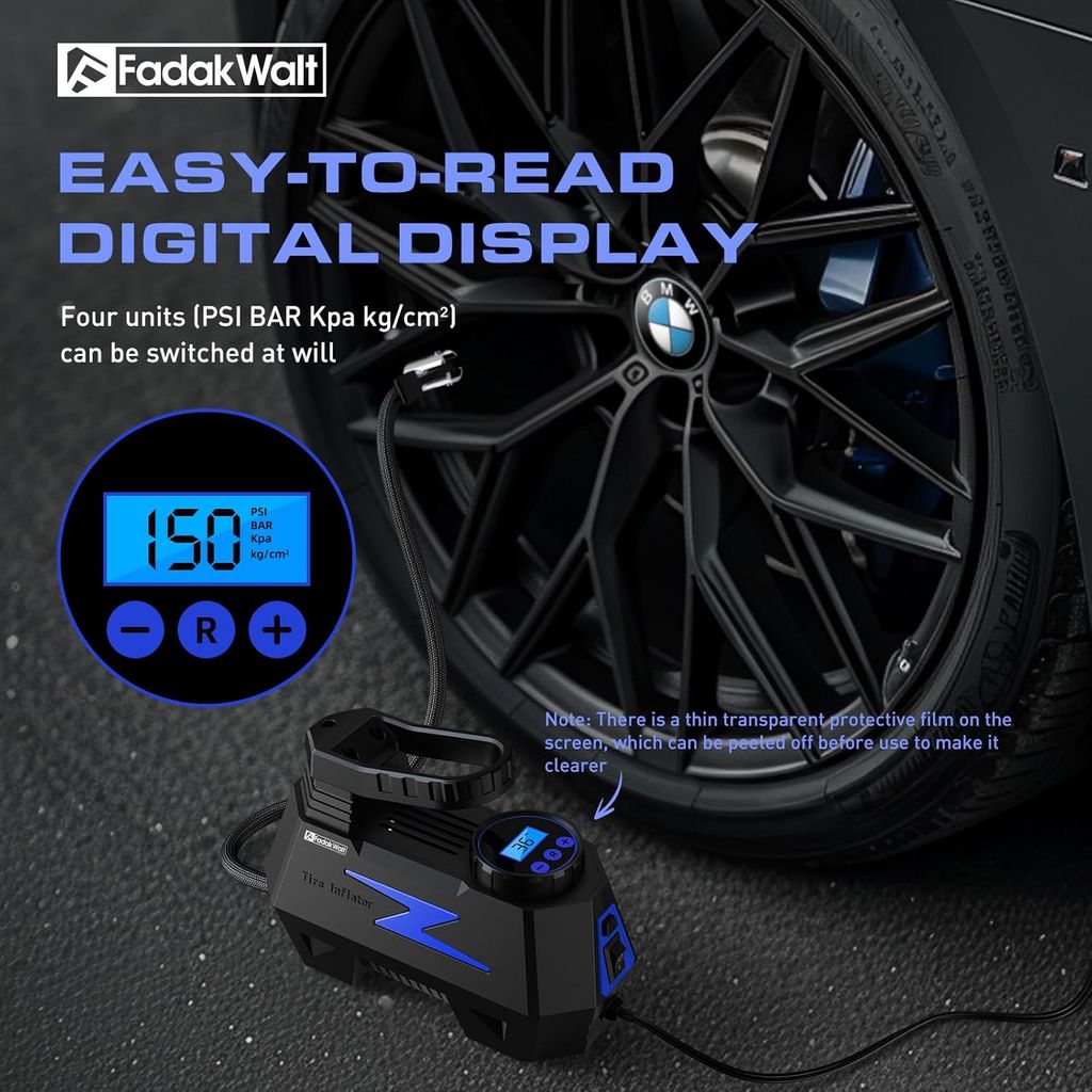 FADAKWALT Tire Inflator Portable Air Compressor, DC 12V Tire Air Pump with LED and 150PSI Digital Pressure Gauge, Portable Tire Inflator for Car Tires, Motorcycles, Bike, Ball (Blue)