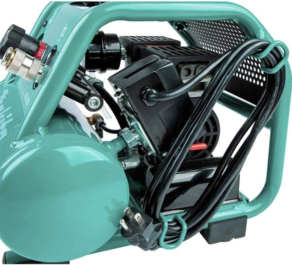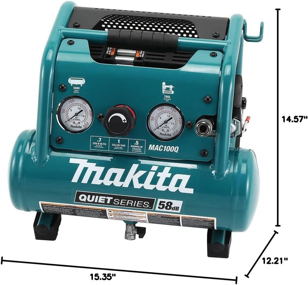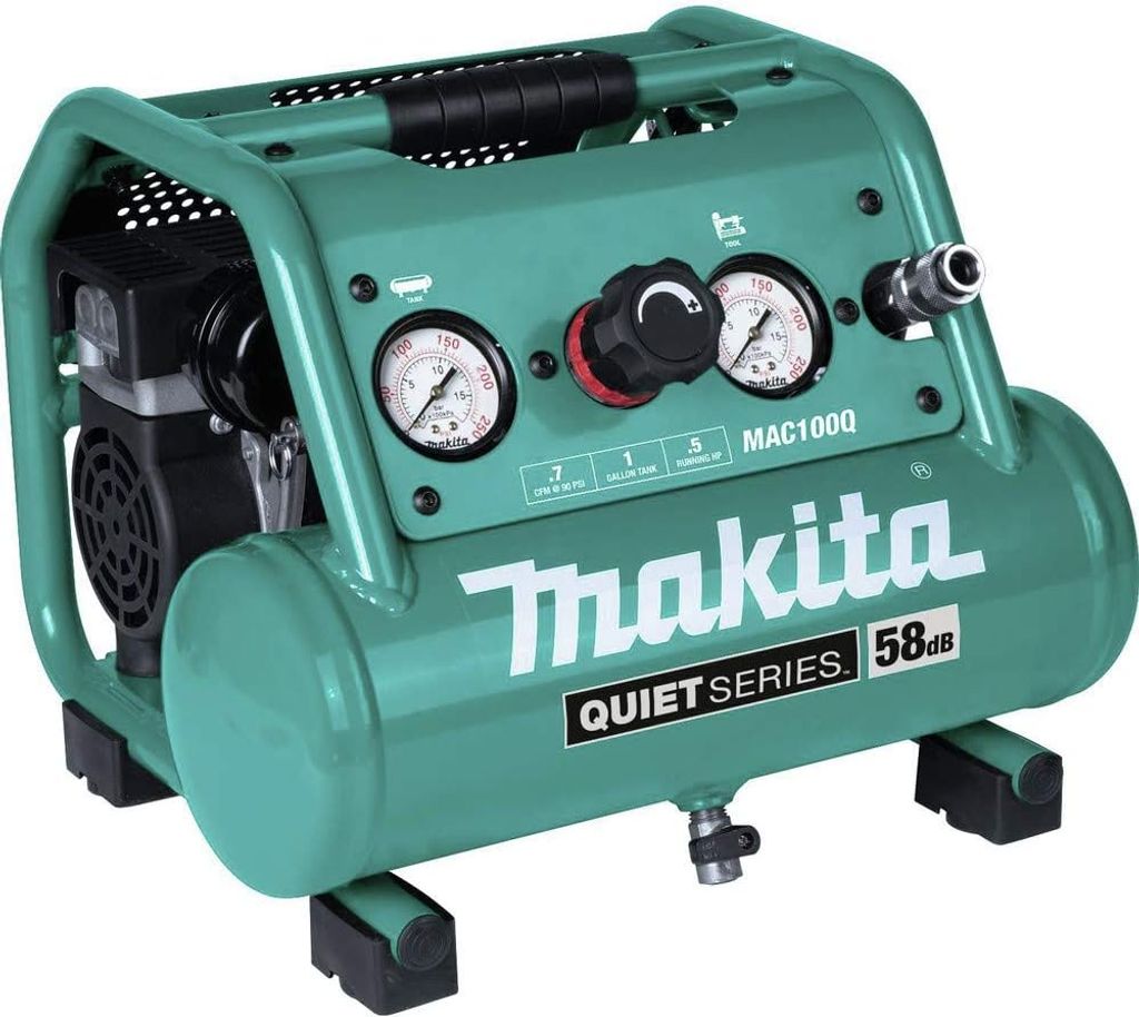Compressors are workhorse tools on the job site and in the work shop. Makita Air Compressors are favorites for their faster recovery time, lower noise, longer tool life, and consistent performance. The Makita ½ HP 1 Gallon Compact, Oil-Free, Electric Air Compressor (MAC100Q) features a Quiet Series Design, combining strong performance with lower noise. At only 58 dBA, it’s ideal for indoor use during case and base installation, trim and finish carpentry, cabinet or furniture making, and more. The MAC100Q runs at a lower RPM, resulting in longer motor and pump life. It is powered by an efficient 1/2 horsepower induction motor that provides up to 135 PSI. It also features a lightweight design (only 25. 5 lbs. ) for increased portability. The roll-cage construction provides added protection for the pump and motor assembly during transportation, in storage, and on the job site. Additional features include a low AMP draw that reduces the incidents of tripped breakers at start-up, as well as an oil-free dual-piston pump designed for maintenance-free operation.