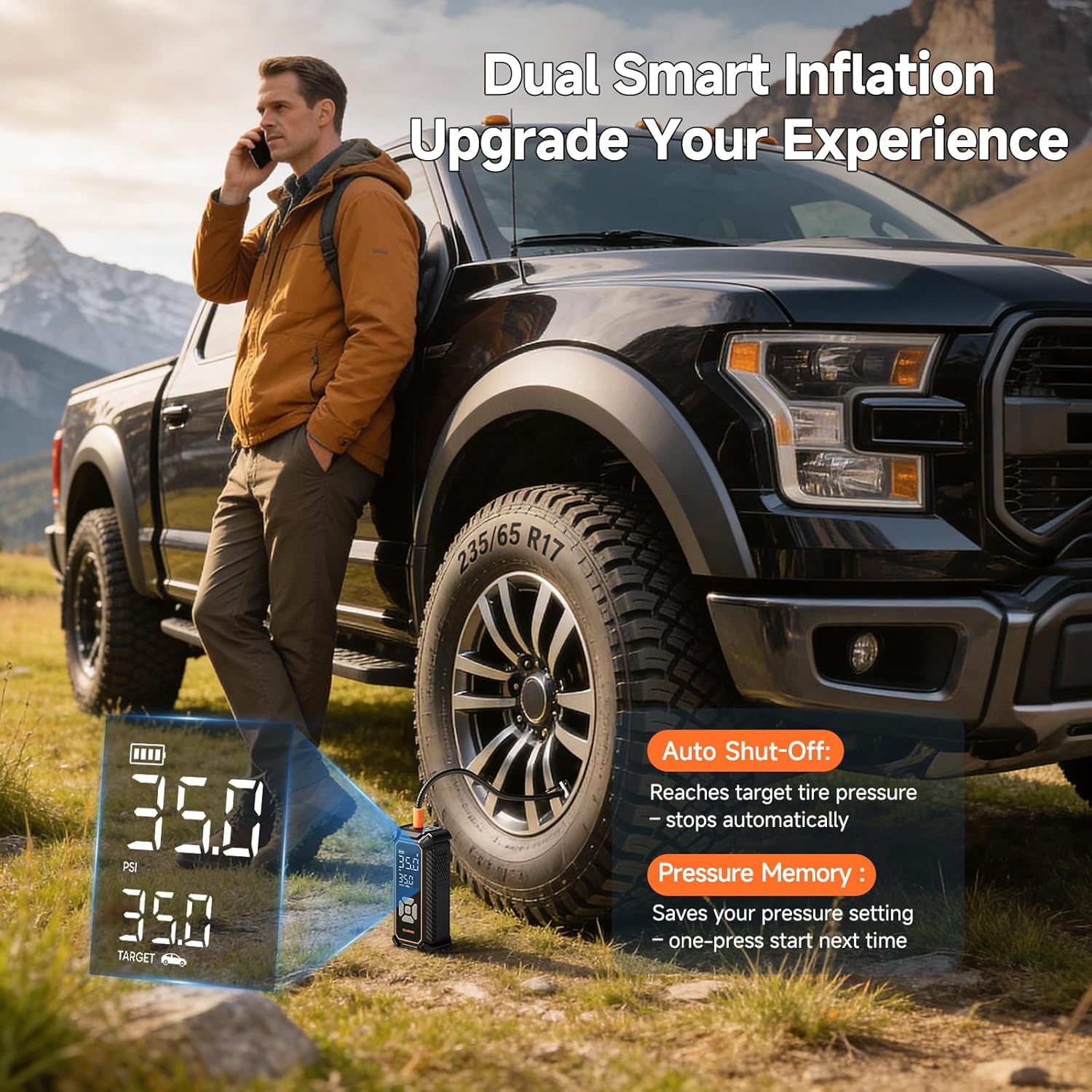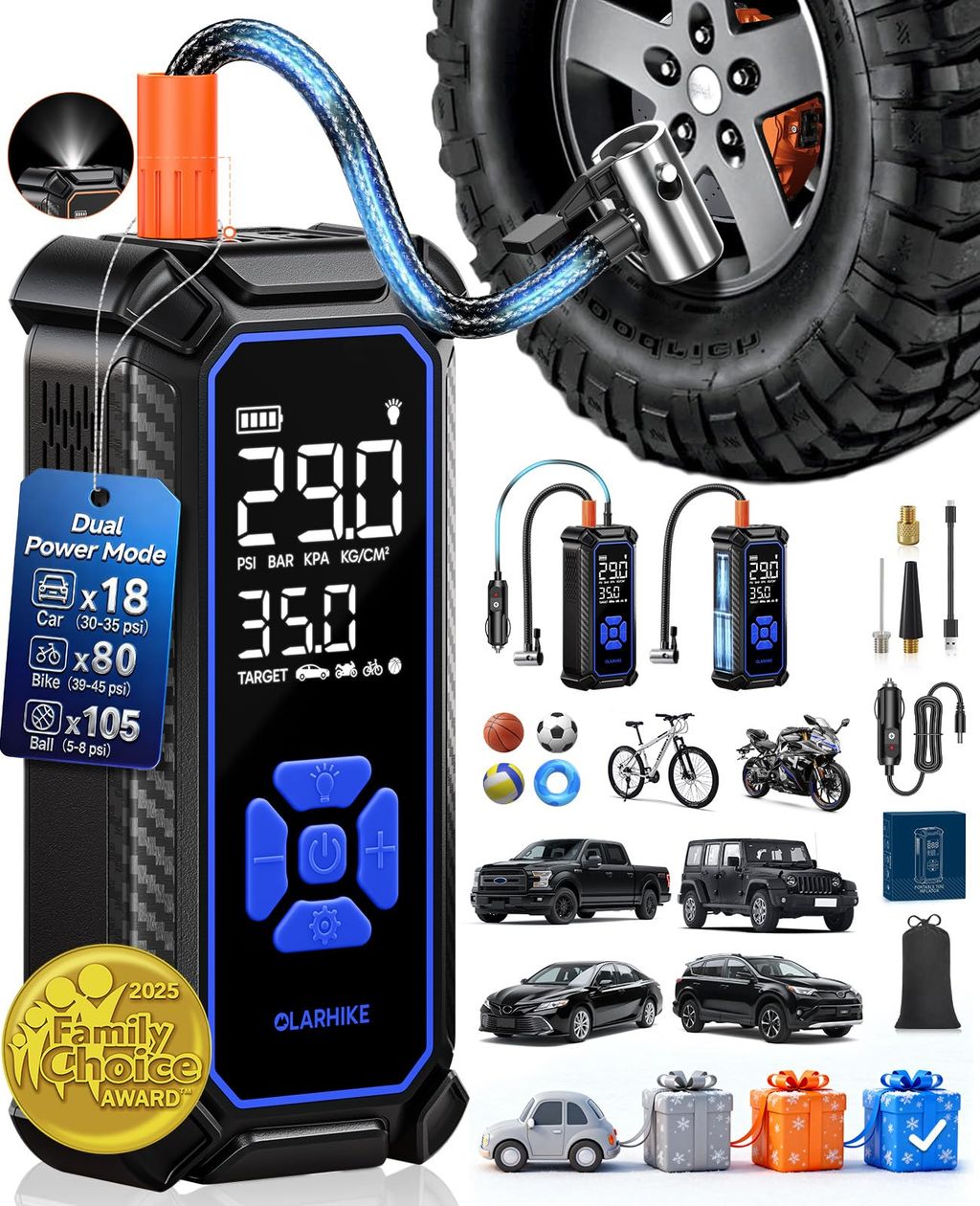 OlarHike Tire Inflator Portable Air Compressor, 150PSI Dual Power - 6000mAh & 12V DC, Cordless Air Pump for Car Tires, Bike, Motorcycle, Balls with LED & Digital Pressure Gauge, Car Gifts