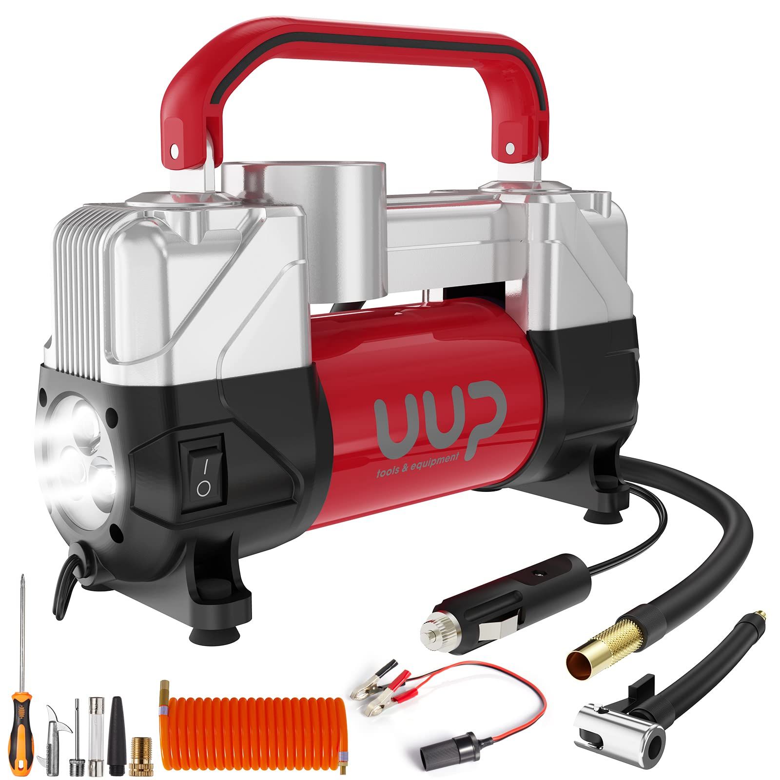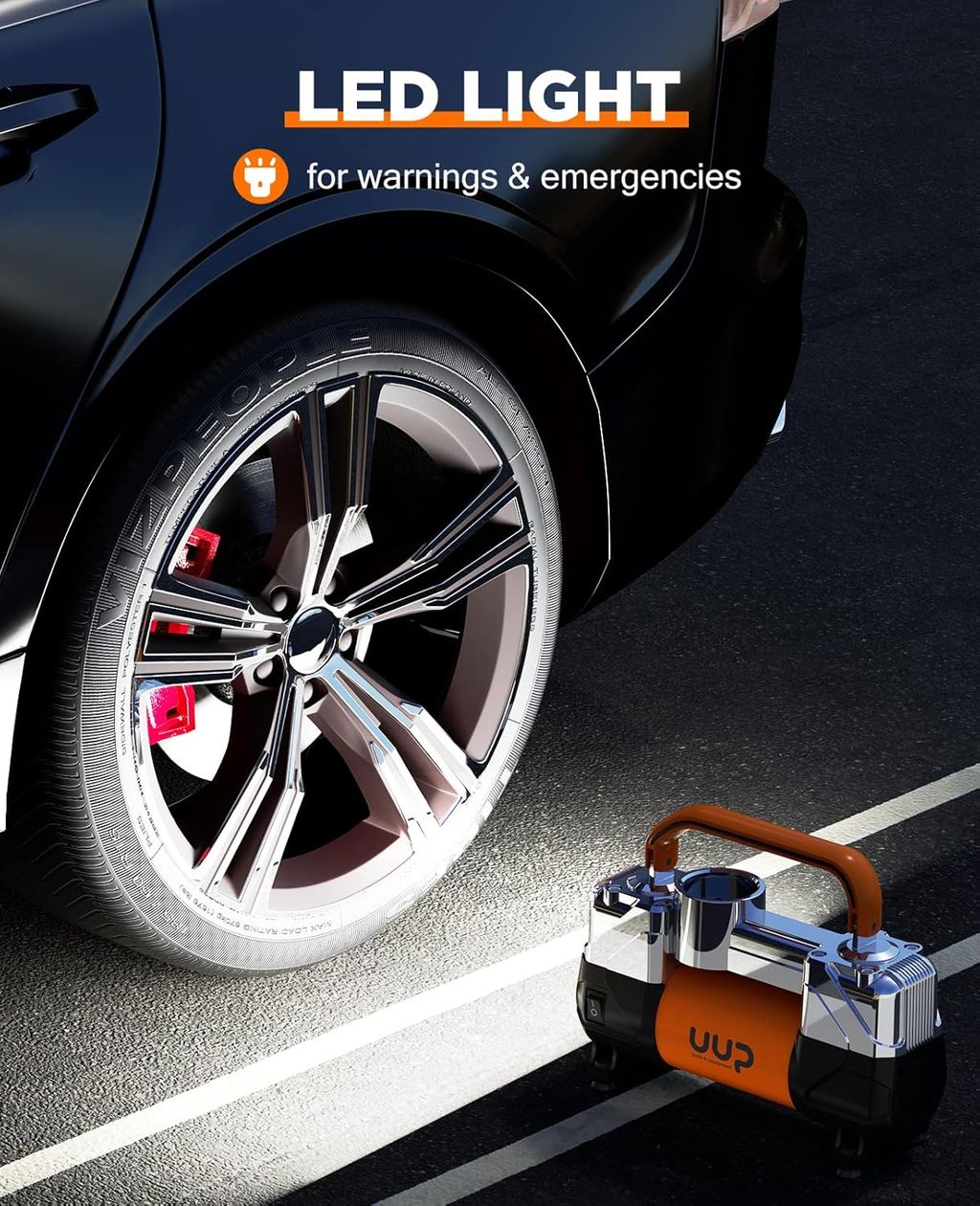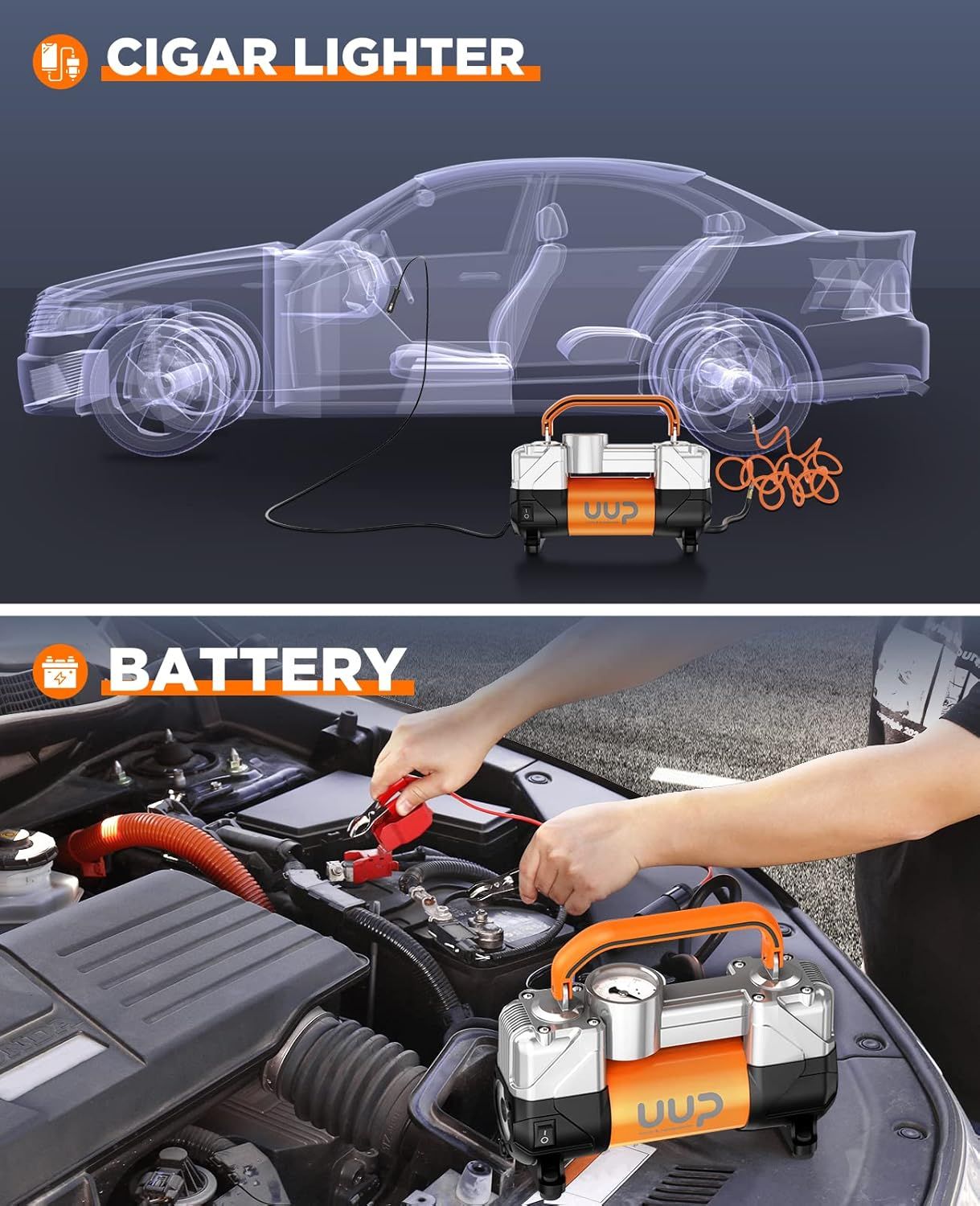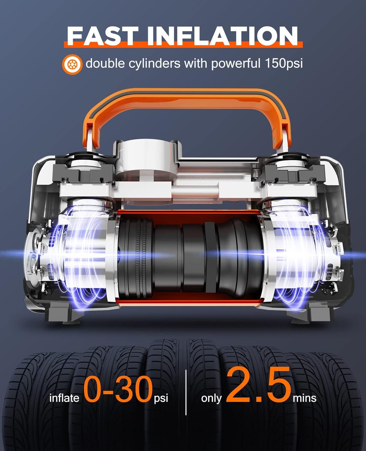 Tire Inflator Air Compressor, 150PSI 12V DC Double Cylinders Heavy Duty Portable Air Pump w/Emergency LED Light for Truck, SUV, Car, RV