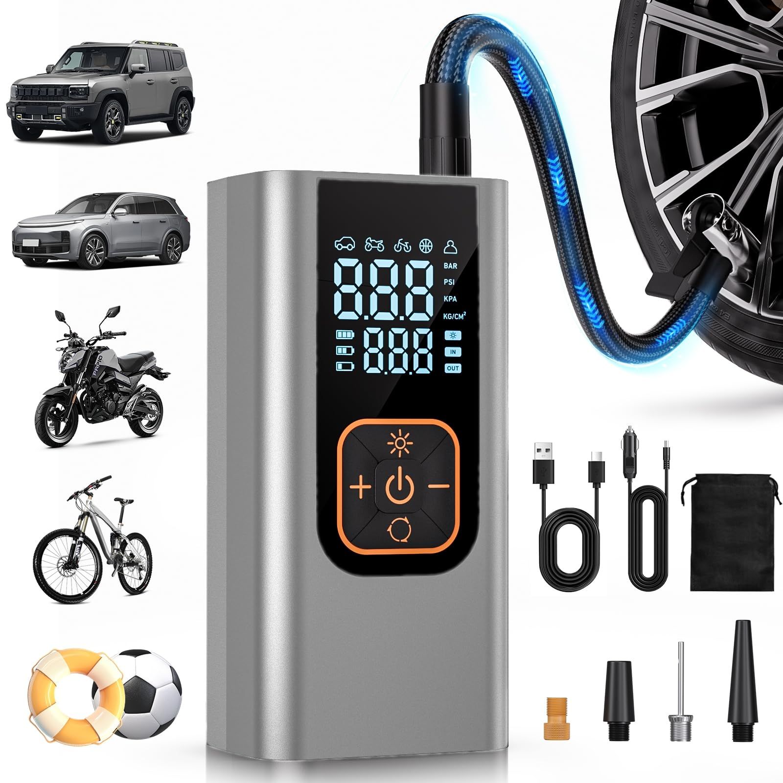 180PSI Tire Inflator Portable Air Compressor, 6X Faster Air Pump for Car Tires with Digital Pressure Gauge, 12V DC Adapter, LED Light, Portable Tire Inflator for Car, Motorcycle, Bike, Obsidian