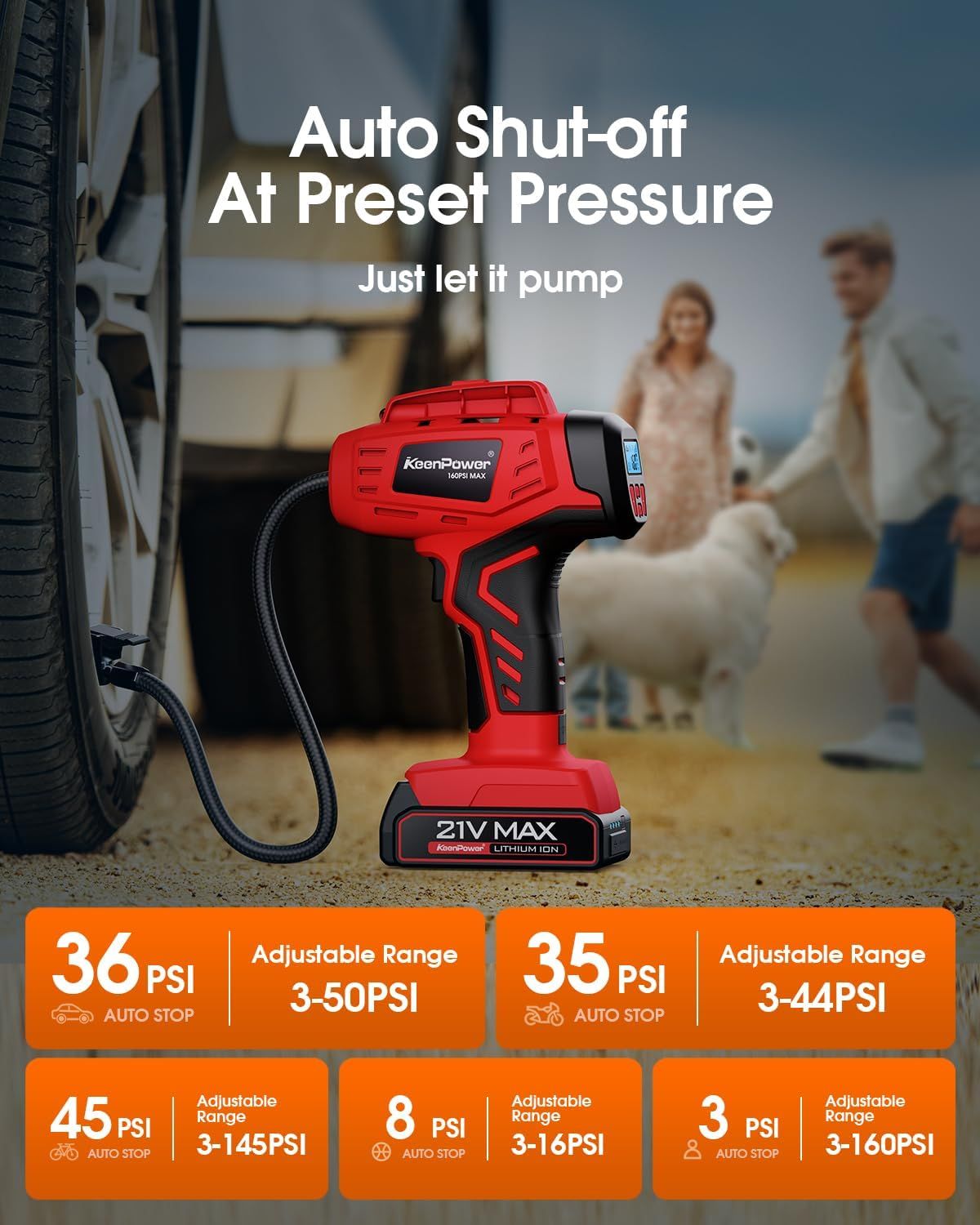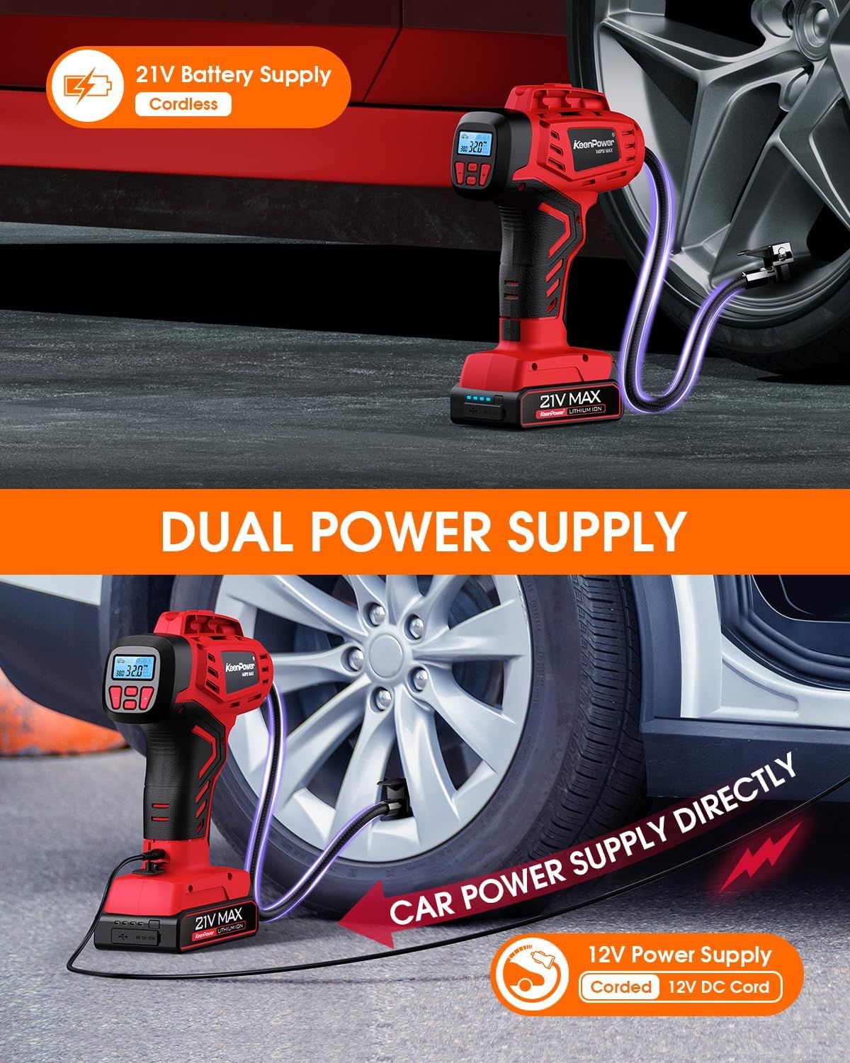 KeenPower Digital Cordless Tire Inflator Portable Air Compressor Automatic 160PSI w/Gauge Screen & 4+N Smart Mode & Dual Power Supply, Rechargeable 21V Battery Powered Handheld Air Pump, Car Tire Pump