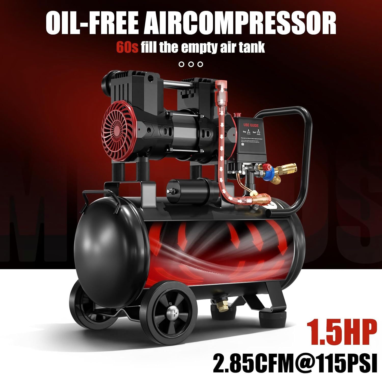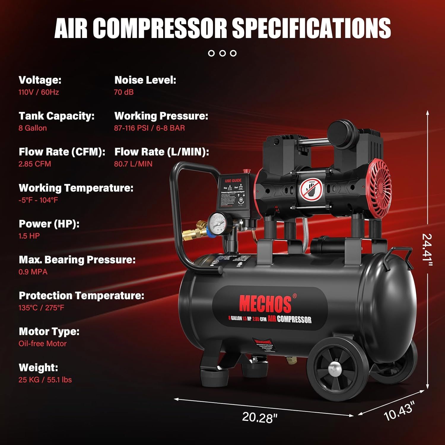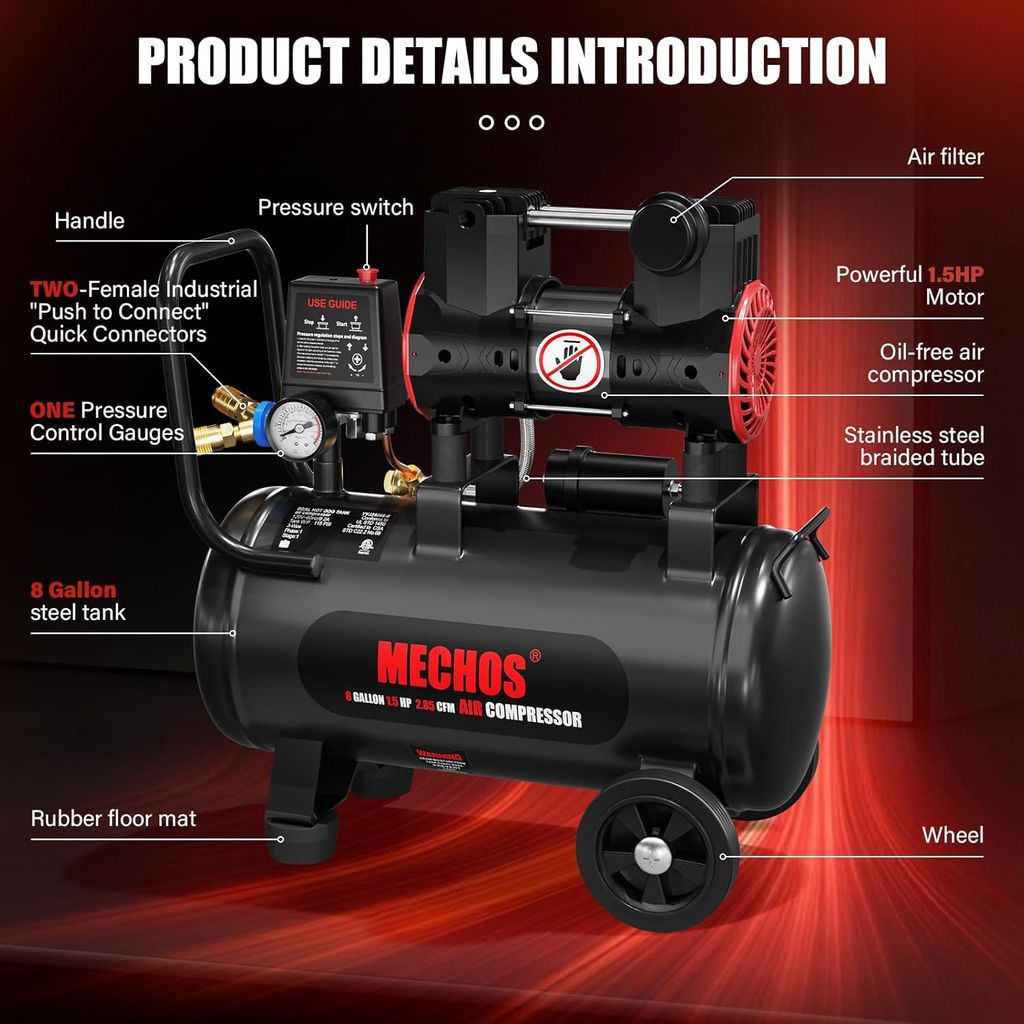 Portable Air Compressor with 8 Gallon Steel Tank, 1.5 HP 2.85 CFM @ 90 PSI, 116 Max PSI Oil-Free Air Compressor for Garage, Home Use, Tire Inflation, Nail Gun, DIY Projects,110V