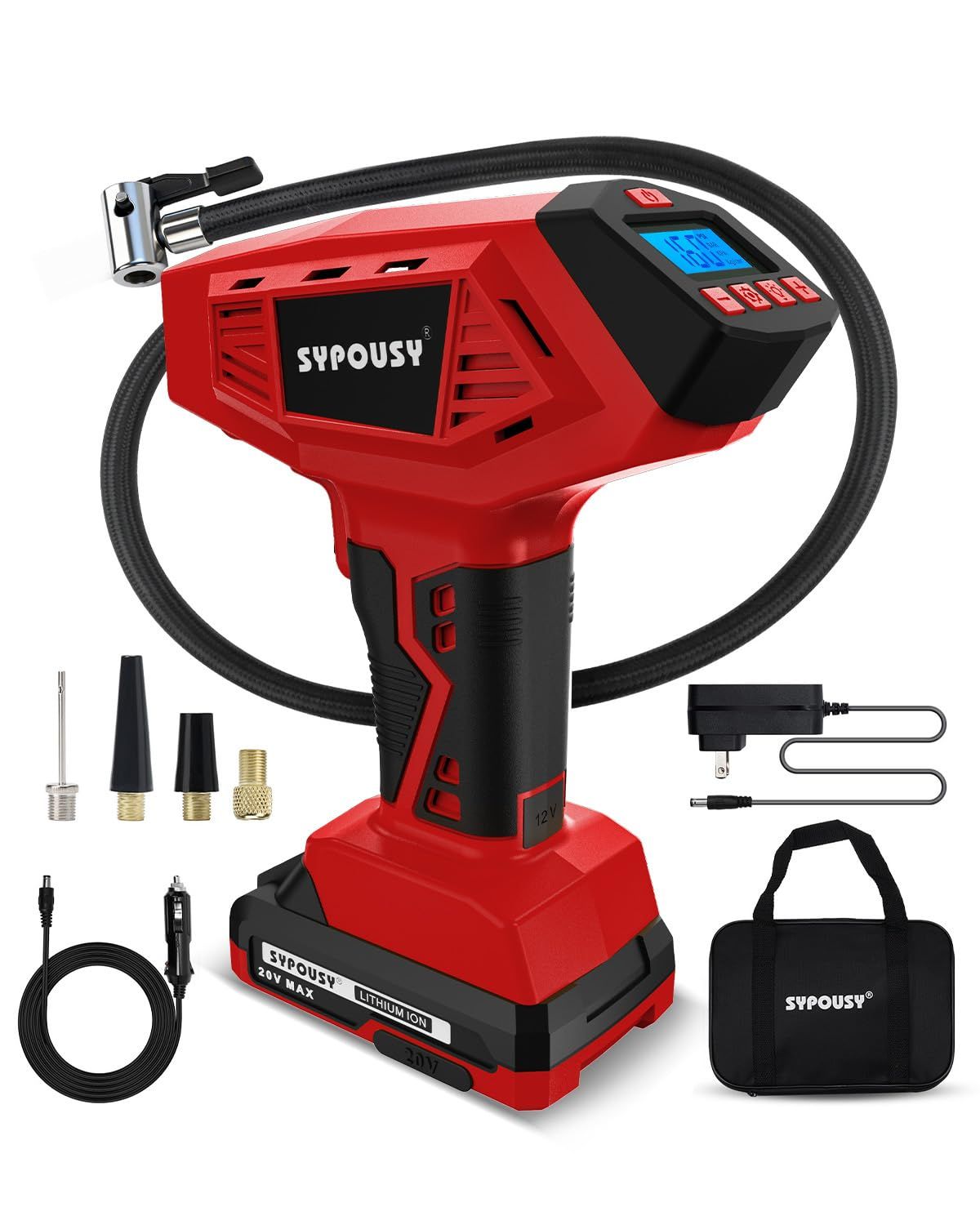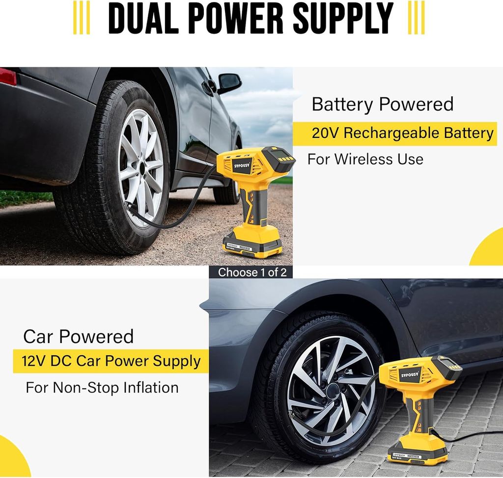 • The SYPOUSY compressor features dual power options—cordless and corded. Use the built-in rechargeable battery for on-the-go convenience or connect to your car’s 12V outlet. Its dual design ensures consistent performance wherever you need it.